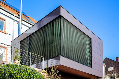 Pfosten- Riegelfassade Schüco FW 50.HI Sonnenschutz- Raffstore